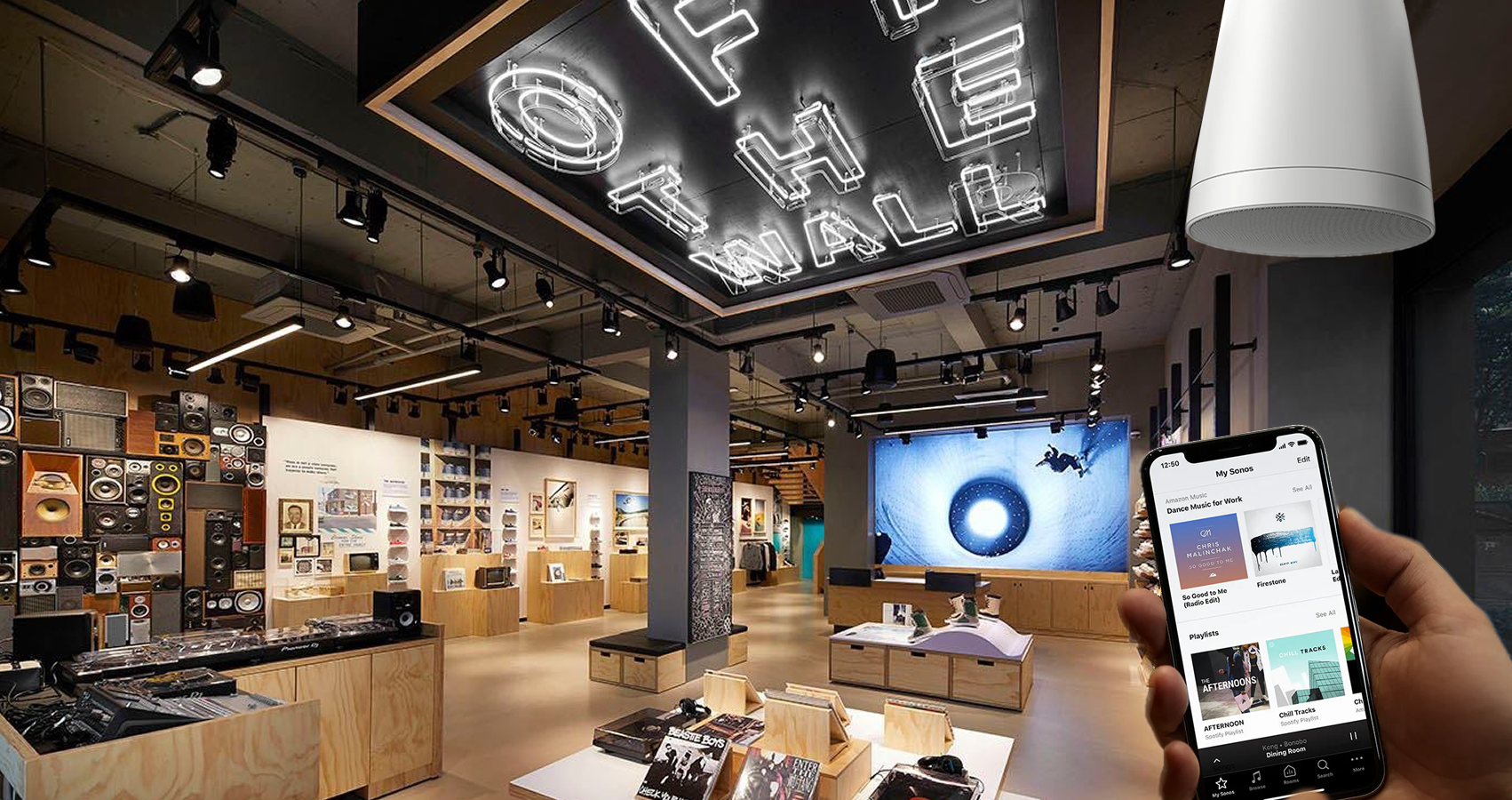 Quickly & Easily deploy a great background music system, and even create different zones with Sonos App using the grouping functions.
